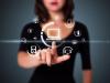 Businesswoman Pressing a Button on Virtual Screen PowerPoint Template