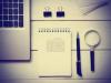 Notebook with Magnifying Glass on Wooden Workplace PowerPoint Template